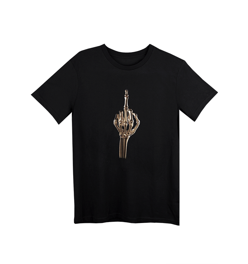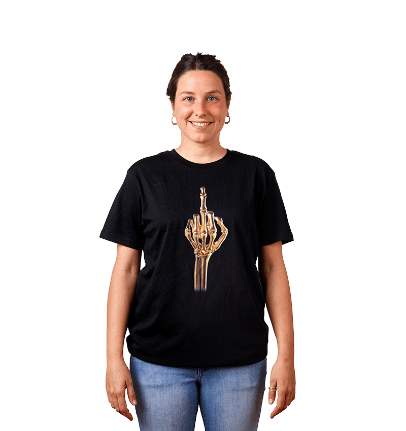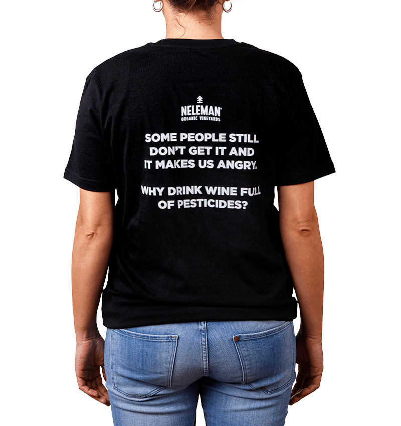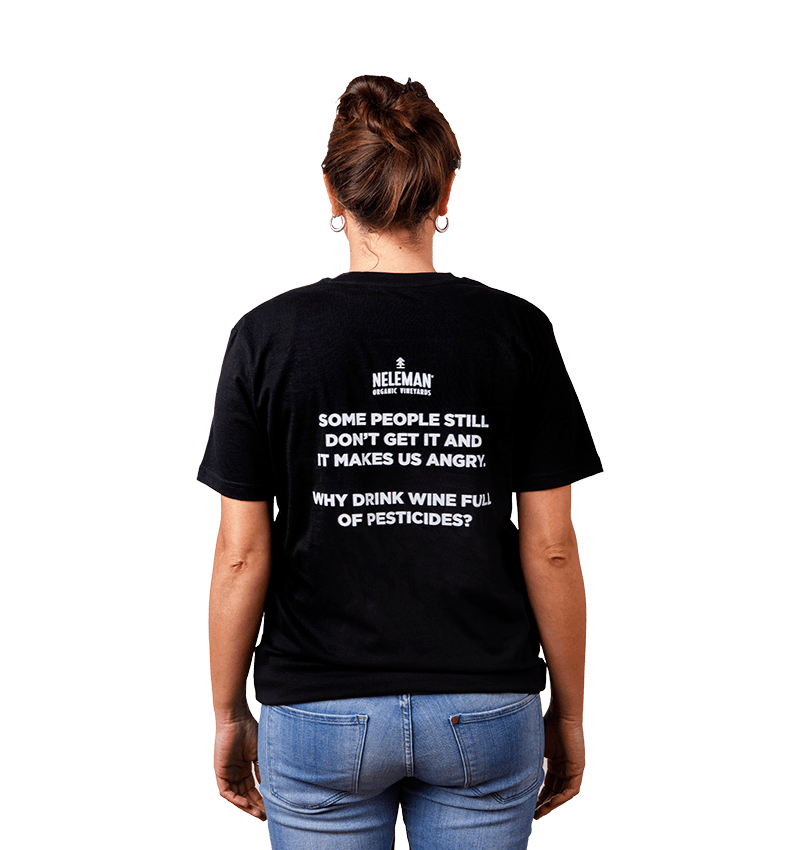 Katoenen T-shirt van Neleman met een 'gouden' middelvinger. Geen middelvinger naar je medemens, maar een middelvinger naar het gebruik van pesticiden in wijnbouw. Dat is niet nodig en dat doen wij dus niet. Bij Neleman maken we onze wijn gifvrij. Good wine to save the world!