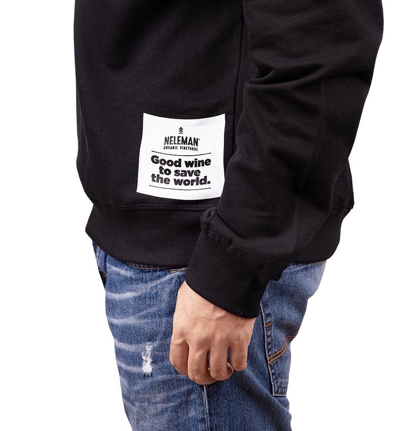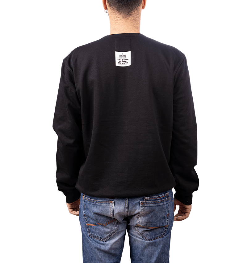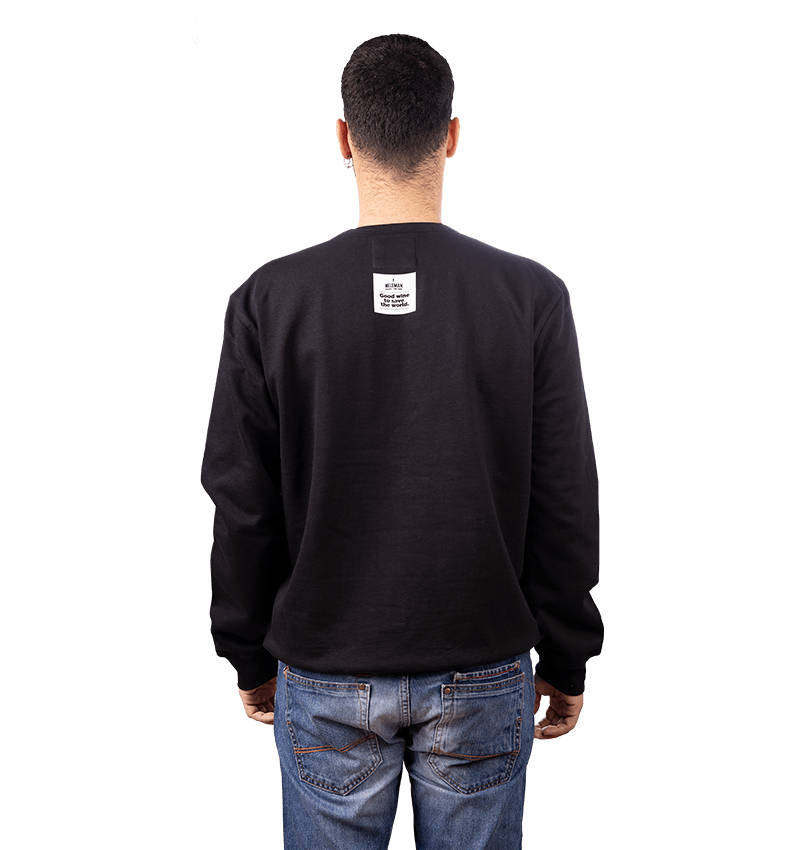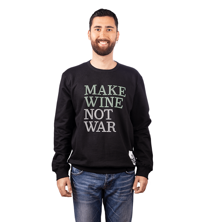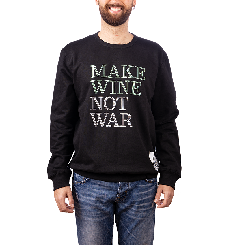 Katoenen zwarte trui met groene en witte belettering met de tekst: Make Wine Not War.