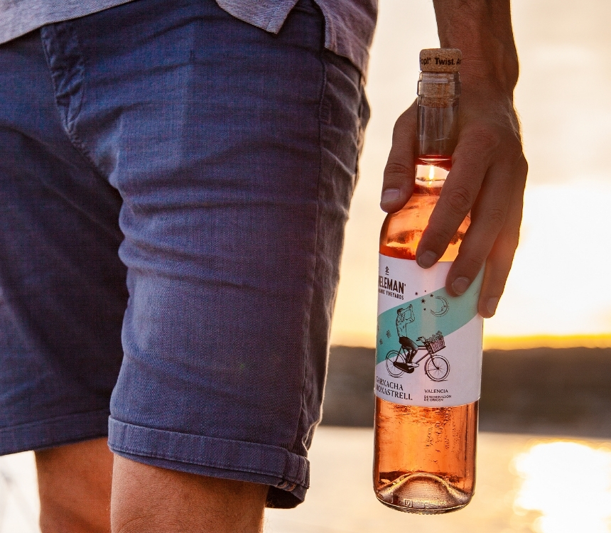 Op het etiket is een prominente rol weggelegd voor de fiets. Hiermee leggen we de link tussen de Spaanse wijn en de Nederlandse wijnmaker. Je ziet Derrick op zijn fiets, met een mand vol druiven. Daarnaast staat er een maan op het label, die staat voor de nacht. Het bijzondere aan deze wijn is namelijk dat de druiven ’s nachts worden geplukt! Design: Sam Allan en illustratie etiket: Guido van Gerven