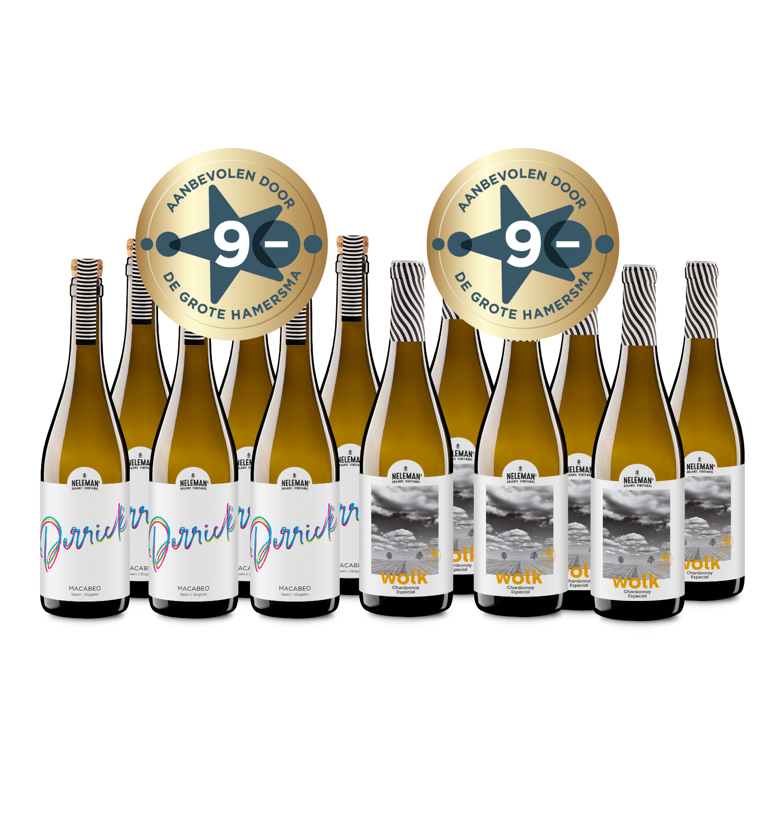 Dit pakket heeft een sterrenstatus! Het pakket bestaat uit zes flessen Wolk Chardonnay especial en zes flessen Derrick Macabeo.