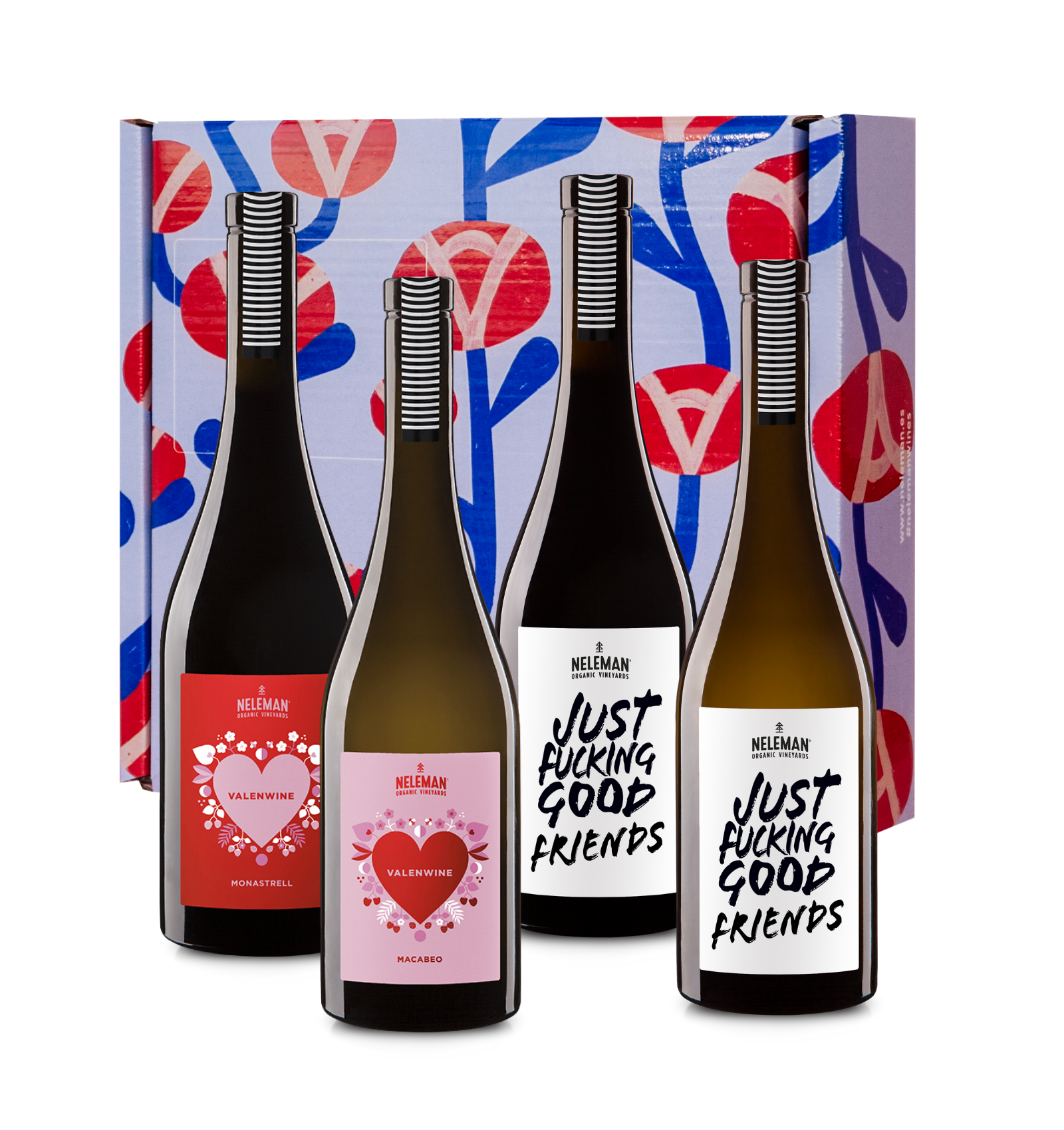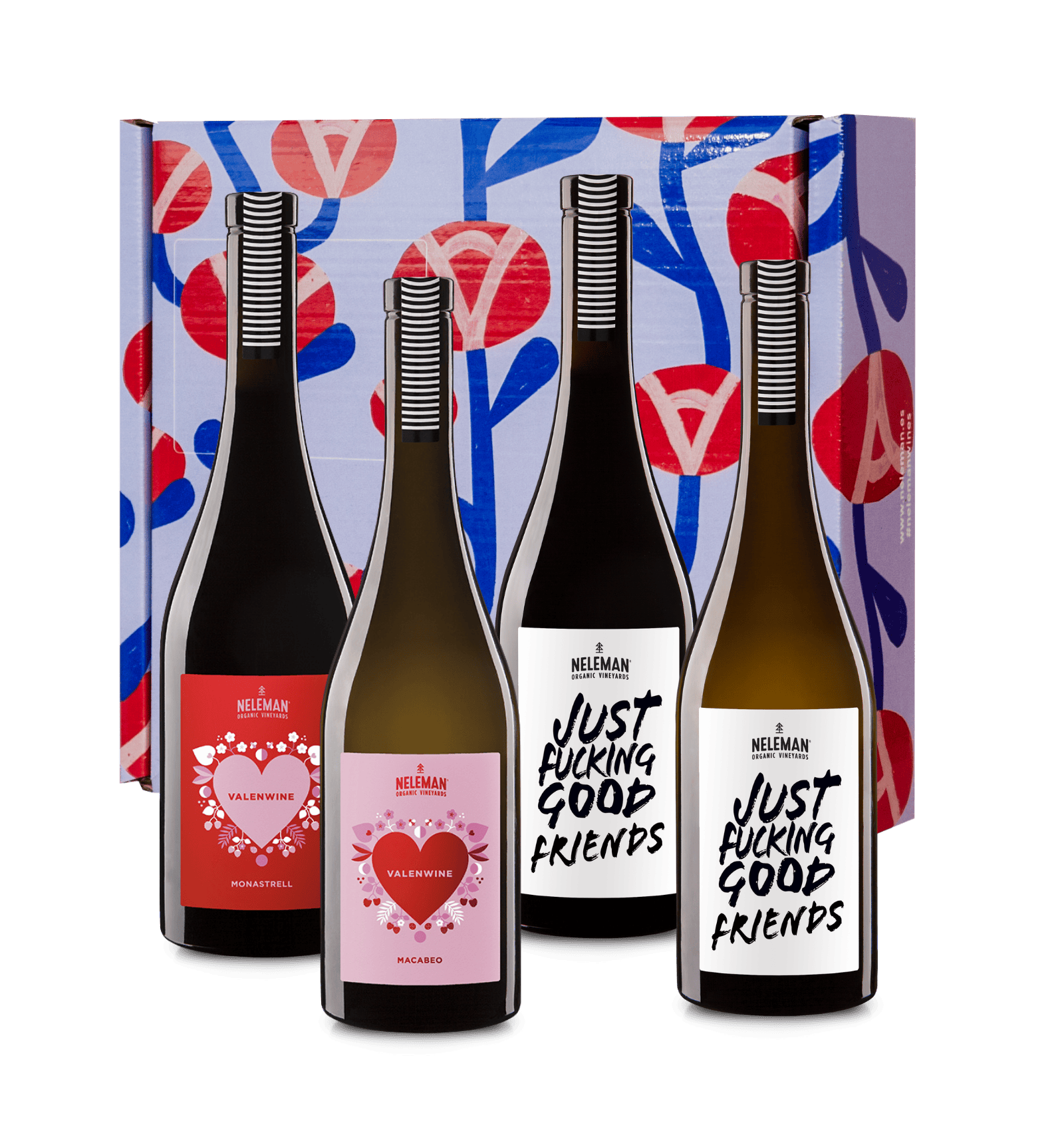 Een prachtig pakket, met 4 liefdevolle wijnen in een bijzondere bloemendoos.